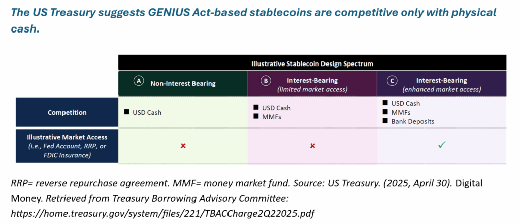 Despite rapid growth, stablecoins are unlikely to pull deposits away from the banking system. With no interest payments allowed under the GENIUS Act and greater risk than insured bank deposits, US consumers and businesses have little incentive to shift funds.