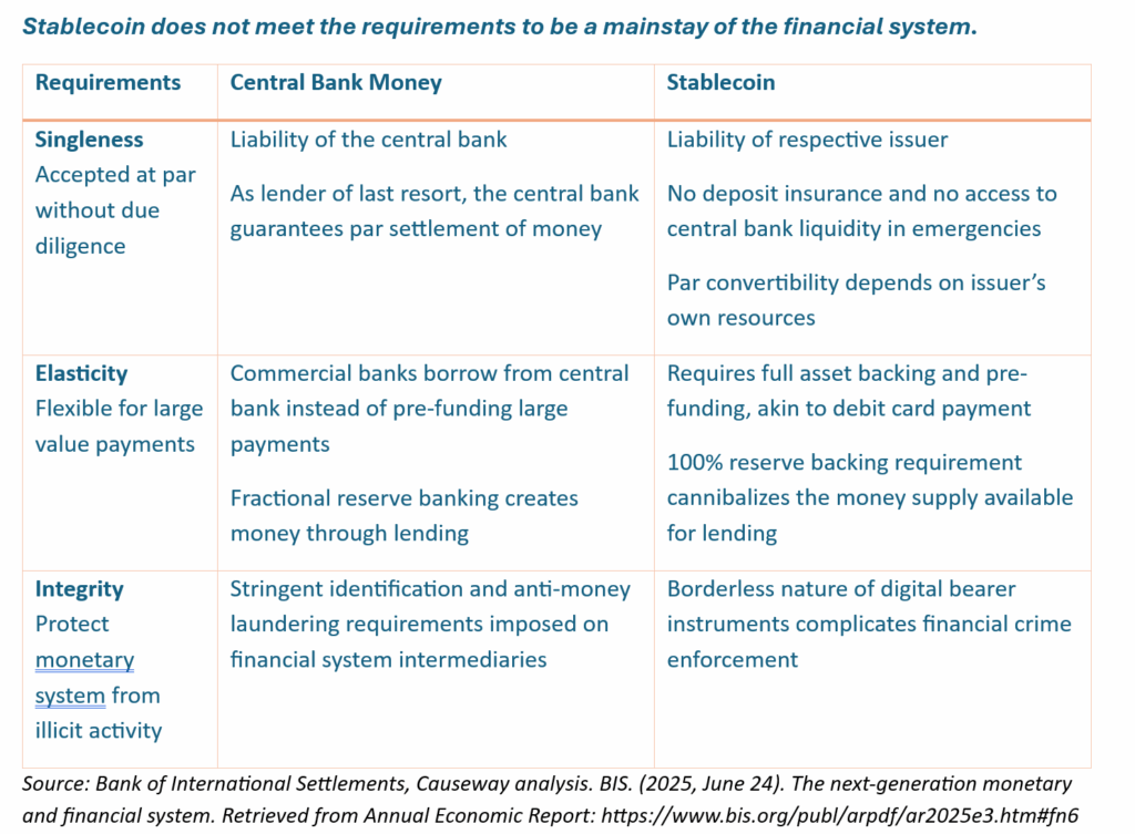 In the US, unlike bank deposits, stablecoins don’t have FDIC insurance or access to Federal Reserve liquidity. In periods of market stress, there’s no guarantee that one stablecoin will always equal one US dollar. This lack of “par convertibility” makes stablecoins riskier than Federal Reserve money, which limits their suitability for the trillions of dollars in daily financial transactions that depend on certainty and trust.